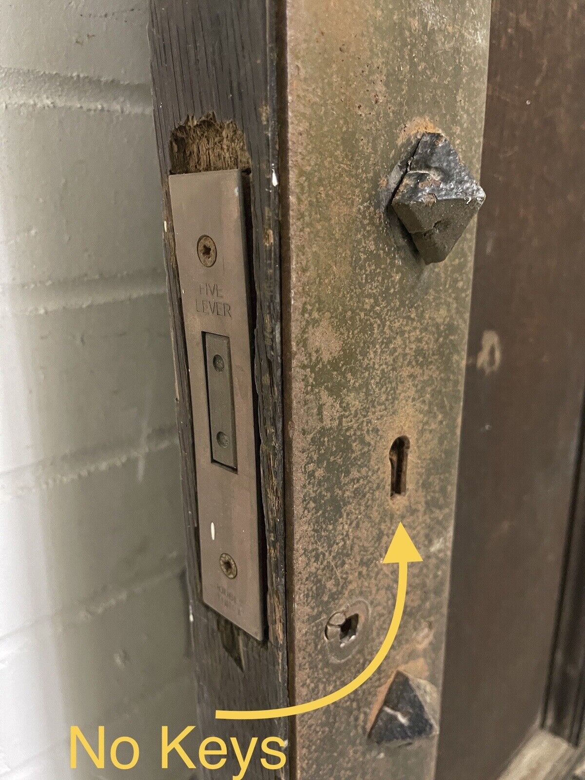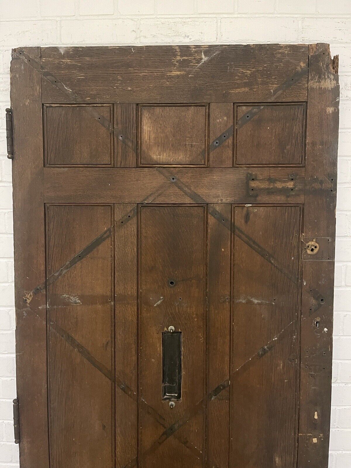 There is a reclaimed metal plate along side of the door which is a feature of the door.