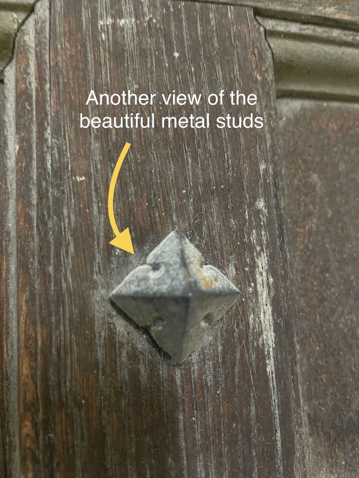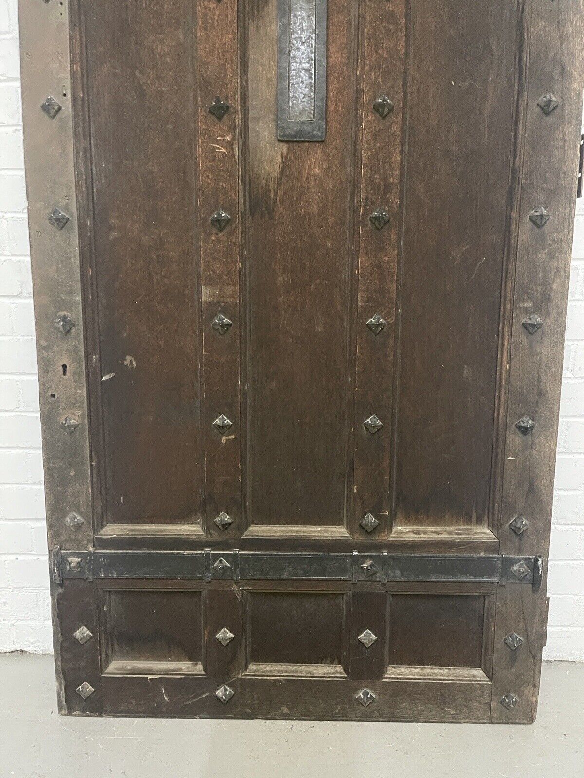 A beautiful reclaimed old oak door with metal studs.